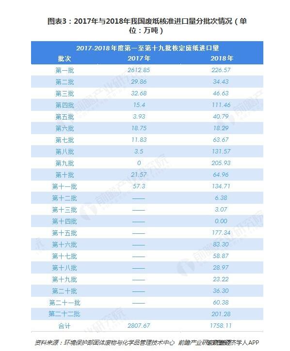 受黨中央領導對于進口洋垃圾的高度重視,環保執法力度日益趨嚴,我國進口廢紙審批總額度審批愈發嚴格,從2015年的5347萬噸迅速降低到2017年的2713萬噸。2018年10月20日,環保部公布了第二十二批廢紙進口審批名單。經前瞻產業研究院統計,截至2018年10月20日,這二十二批進口廢紙審批總量不足1800萬噸。