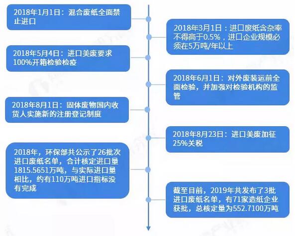 2018年,進口固體廢物的相關政策和中美貿易戰的影響貫穿全年,成為影響進口廢紙數量的最重要因素。截至目前,2019年共發布了四批進口廢紙名單,有71家造紙企業獲批,總核定量為553.682萬噸。此外,中國生態環境部表示2019年,洋垃圾入境管控將會更為嚴格,而進口廢紙自然也會被牽涉其中。