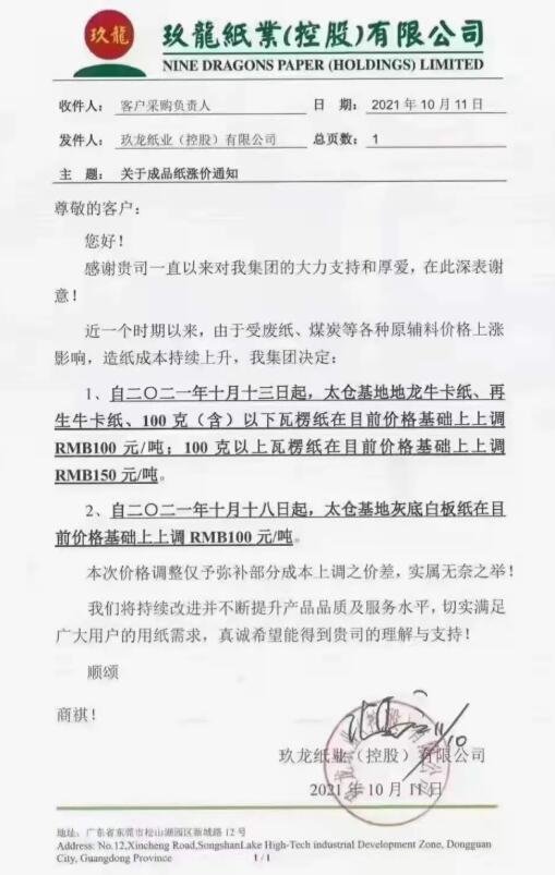 自2021年10月13日起,太倉基地地龍牛卡紙、再生牛卡紙、100克(含)以下瓦楞紙在目前價格基礎上上調100元/噸,100克以上瓦楞紙在目前價格基礎上上漲150元/噸。