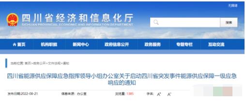 為全力以赴保安全、保民生、保重點,盡最大努力減少對全省經濟發展和人民群眾生產生活的影響,堅決打贏電力保供攻堅戰,按照《四川省突發事件能源供應保障應急預案(試行)》規定,經批準,決定于8月21日00:00啟動四川省突發事件能源供應保障一級應急響應。