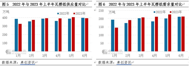 上半年業者對瓦楞紙市場需求改善存較強預期,但進入復蘇由預期走向現實的驗證期后,市場發現需求改善的程度未能達到心理預期,因此預期差導致了市場的走弱,進而導致市場供大于求矛盾凸顯。當前瓦楞紙行業處于產能優化期,上半年新增產能30萬噸,但部分紙廠轉產疊加長期停機,綜合產能減少33萬噸。從產量方面來看,受到上半年行業盈利水平持續收窄,疊加需求減弱影響,瓦楞紙上半年行業平均開工負荷率由2022年上半年的57.80%下降至今年的54.16%,產量同比減少2.21%。但受到進口紙大幅增量影響,總供應量較去年同期增幅1.70%。