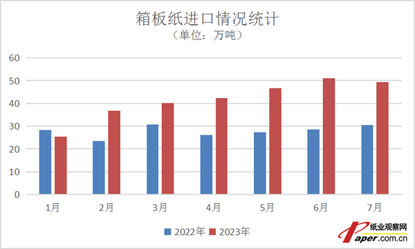 其中,7月當(dāng)月箱板紙進口量為49.37萬噸,環(huán)比下降3.35%,同比增長62.14%,進口額為22793.96萬美元,同比增長11.67%;出口量為0.68萬噸,環(huán)比增長9.68%,同比下降49.96%,出口額為782.34萬美元,同比下降59.43%。