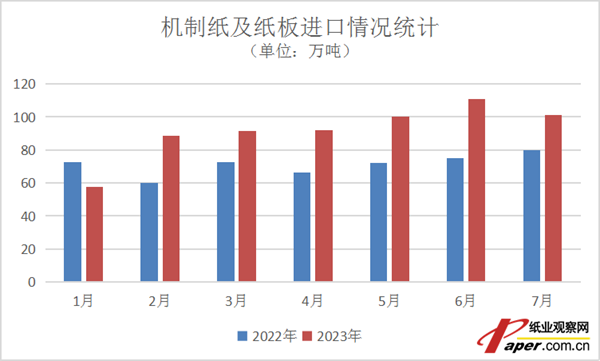 紙業(yè)觀察網(wǎng)對造紙行業(yè)數(shù)據(jù)分析顯示,2023年7月,機制紙及紙板進口量為101.42萬噸,環(huán)比下降6.87%,同比增長27.29%,進口額為51508.34萬美元,同比增長5.50%;機制紙及紙板出口量為55.38萬噸,環(huán)比增長3.03%,同比下降14.18%,出口額為56144.98萬美元,同比下降24.65%。