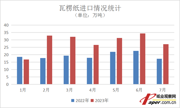 7月當(dāng)月瓦楞紙進口量為27.14萬噸,環(huán)比下降20.92%,同比增長57.62%,進口額為10369.14萬美元,同比增長12.63%;出口量為0.27萬噸,環(huán)比下降3.57%,同比下降25.60%,出口額為338.66萬美元,同比下降37.29%。