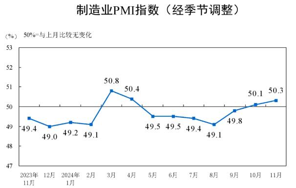 另外,從國家統計局發布的《2024年11月中國采購經理指數運行情況》數據顯示,新訂單指數為50.8%,比上月上升0.8個百分點。