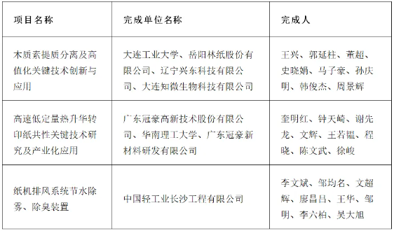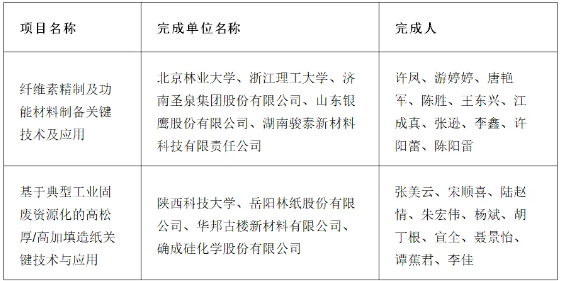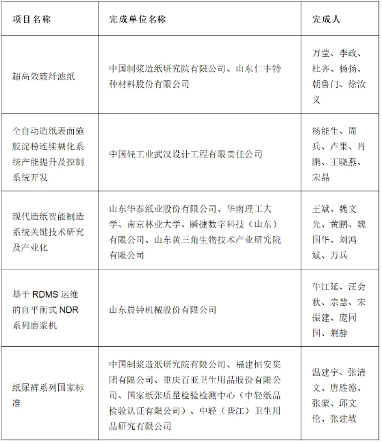 2024年12月12日,中國輕工業聯合會科學技術獎勵委員會評審通過的《2024年度中國輕工業聯合會技術發明獎建議獲獎項目名單》《2024年度中國輕工業聯合會科技進步獎建議獲獎項目名單》在“中國輕工業聯合會”網站上向社會進行公示。造紙行業多個項目上榜科技進步獎,包括科技進步獎一等獎(2項)、科技進步獎二等獎(3項)、科技進步獎三等獎(5項)。