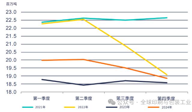 從各類紙張的增長情況來看,包裝紙仍然是表現最為突出的紙種,其增長速度繼續領先于生活用紙和印刷紙。歐洲商品漿產量基本維持在2019年至2022年間的平均水平,但在2024年則略有下降,降幅為1%,與上一年的增長態勢(增長2.3%)相比有所回落,這一下滑主要受到出口活力減弱的影響。