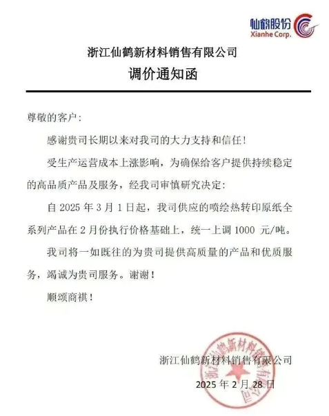 浙江仙鶴新材料:自2025年3月1日起,我司供應(yīng)的噴繪熱轉(zhuǎn)印原紙全系列產(chǎn)品在2月份執(zhí)行價(jià)格基礎(chǔ)上,統(tǒng)一上調(diào)1000元/噸。