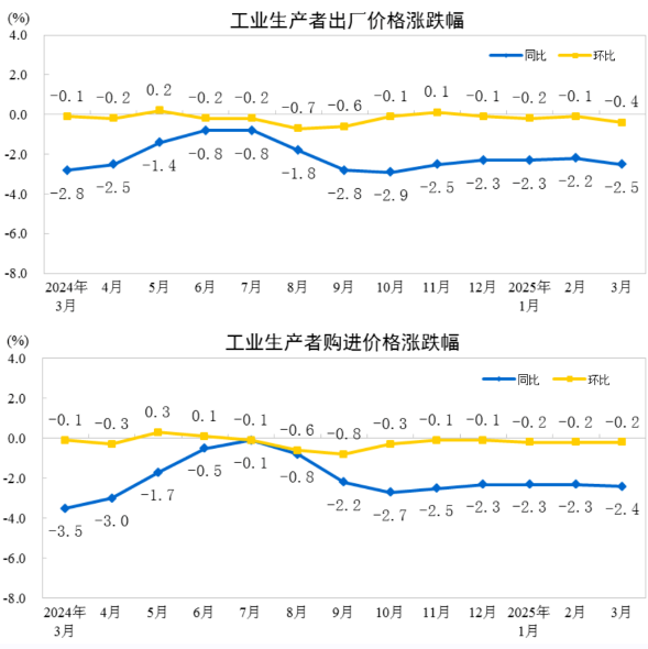 近日,國(guó)家統(tǒng)計(jì)局發(fā)布2025年3月份工業(yè)生產(chǎn)者出廠價(jià)格數(shù)據(jù)情況。2025年3月份,全國(guó)工業(yè)生產(chǎn)者出廠價(jià)格同比下降2.5%,環(huán)比下降0.4%;工業(yè)生產(chǎn)者購(gòu)進(jìn)價(jià)格同比下降2.4%,環(huán)比下降0.2%。
