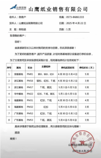 此外,山鷹紙業(yè)也提前發(fā)布了五一假期停機檢修安排,通知顯示,山鷹安徽、浙江、福建、廣東、華東基地將在4月30日-5月6日期間將停機3-5天不等。