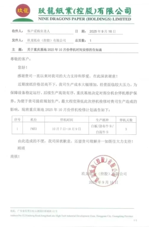 自九月二十二日起,泉州基地所有牛卡、瓦楞紙價格上調RMB30元/噸。