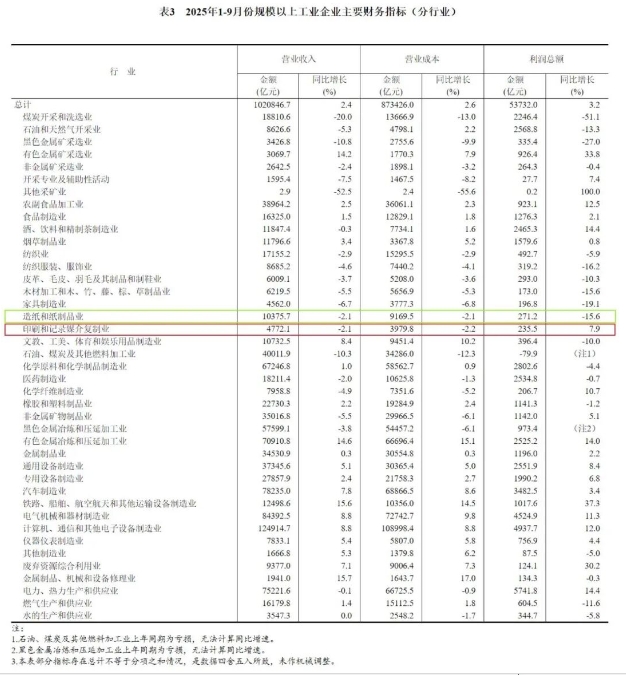 值得關(guān)注的是,造紙和紙制品業(yè)實(shí)現(xiàn)利潤總額271.2億元,同比下降15.6%;印刷和記錄媒介復(fù)制業(yè)實(shí)現(xiàn)利潤總額235.5億元,同比增長7.9%。
