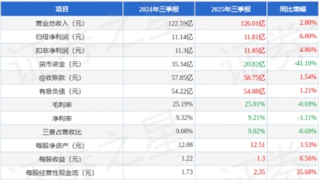 公司營業總收入126.01億元,同比上升2.8%,歸母凈利潤11.81億元,同比上升6.0%。