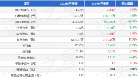 公司營業總收入4.38億元,同比上升2.66%,歸母凈利潤1742.18萬元,同比下降4.83%。