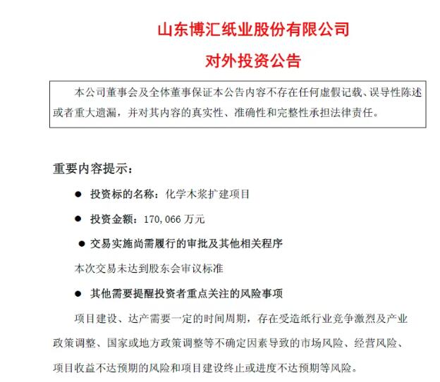 山東博匯紙業股份有限公司(簡稱“博匯紙業”)近日宣布了一項重大的產能結構調整與升級計劃:決定在現有廠區內,利用已有生產線,投資高達170,066萬元進行改擴建,規劃建設年產32萬噸化學漿項目。此舉是公司優化現有原材料產品結構、提升原料與產品多樣化水平的關鍵性戰略布局。