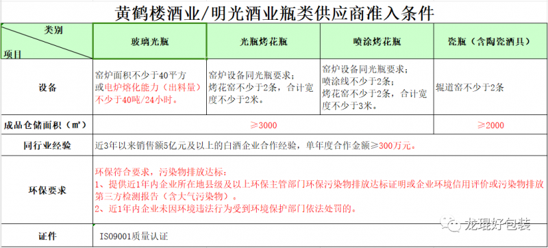 ③黃鶴樓酒業/明光酒業瓶類供應商準入條件