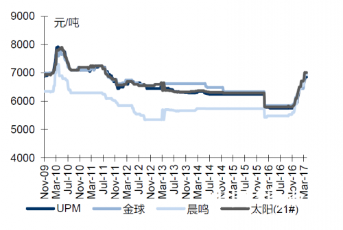 本周雙膠紙紙廠庫存處歷史低位。終端均價為6940元/噸,持平上周。本周各大雙膠紙生產商均處于滿負荷運作狀態,且據各紙廠業務人員反饋,目前庫存均低于去年同期水平,實際庫存周期在10-15天左右,處于歷史低位,訂單多已排產至5月底。目前各地貿易商積極落實新一輪漲價,實際成交價上行趨勢已初露端倪。