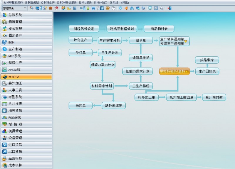 進銷存管理:采購管理(詢價,申購,采購)、銷售管理(報價,訂單,銷貨)、庫存管理(進貨,調(diào)拔,發(fā)料,出貨,盤點,存量(成本,現(xiàn)存量,在制量,在途量,受訂量,上下限等))物流質(zhì)檢