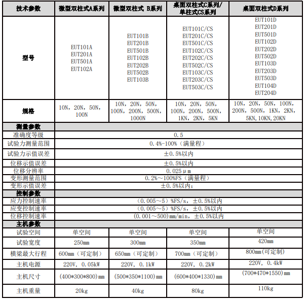 EUT系列A型單柱式微機(jī)控制電子萬能試驗機(jī)具有結(jié)構(gòu) 緊湊、簡單易用等特點,可應(yīng)用于最大載荷 5kN的拉伸、 壓縮、彎曲、剪切、剝離、撕裂等測力試驗。主機(jī)采用強 壯的方形立柱支撐,高精度直線導(dǎo)軌導(dǎo)向,具有很高的剛 性和良好的線性運動特性。選配不同量程的載荷傳感器可 以為小到微米級的纖維,大到滿載的結(jié)構(gòu)件等試樣提供精 準(zhǔn)的測量數(shù)據(jù)。此外,豐富的夾具工裝、變形測量等附件, 幾乎可以滿足客戶所有需求。配套的靈活易用的Testnova 軟件,使用戶試驗過程更加輕松。試驗解決方案涵蓋醫(yī)療 設(shè)備、生物材料、紡織品、彈性體、食品、小型部件、線 材、紙、塑料、薄膜等等。