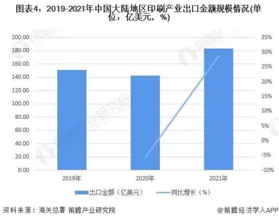 從出口市場來看,2019-2021 年我國印刷行業(yè)出口總額整體呈現(xiàn)先下降后增長的態(tài)勢。2020 年中國大陸地區(qū)出口印刷類產品總金額約 145 億美元,同比下降約 6%;2021 年全年出口印刷總額超過 180 億美元,同比大幅增長 29%。整體來看,國內印刷產業(yè)出口市場恢復較快。
