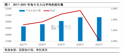 另一方面,近年來人口增速趨緩,2021年總人口增速為0.03%,同比上年收窄0.11個百分點,結合近年國民總人口增長速度來看,幼兒園、小學、中學階段以及高等學校在內的在校生人數增長速度可能將進一步放緩。