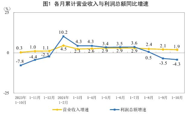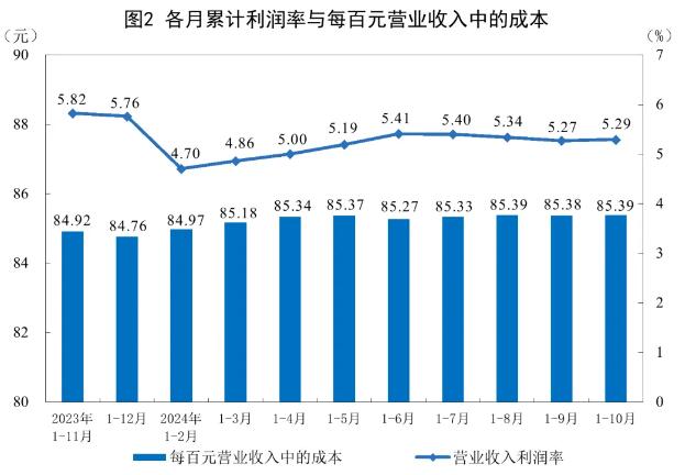 1—10月份,規模以上工業企業實現營業收入110.96萬億元,同比增長1.9%;發生營業成本94.75萬億元,增長2.3%;營業收入利潤率為5.29%,同比下降0.34個百分點。
