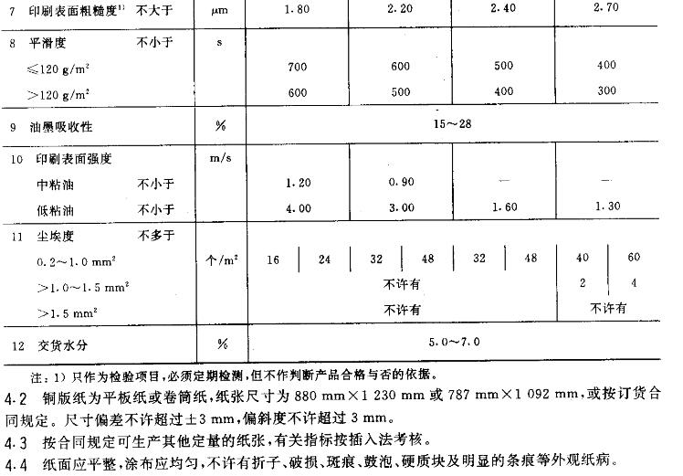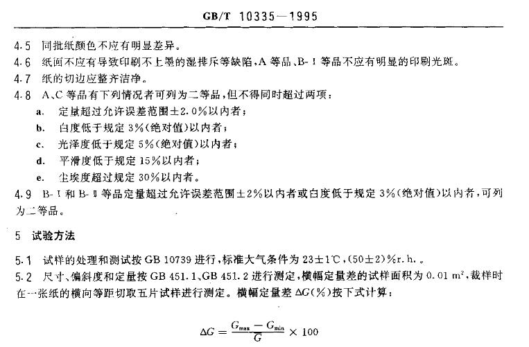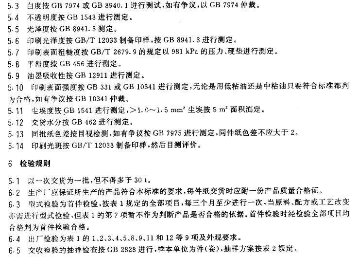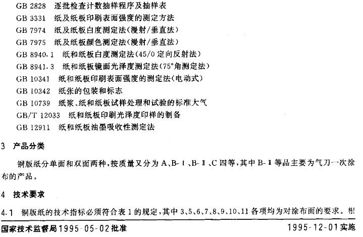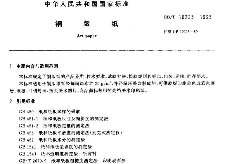 GB/T 10335規定了銅版紙的產品分類、技術要求、試驗方法、檢驗規則和標志、包裝、運輸貯存要求。